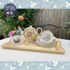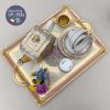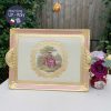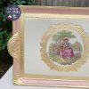 Khay gỗ thủ công do nghệ nhân Ý tại thành phố Florence đục, khắc trạm trổ hoa văn và mạ vàng tinh tế với viền khay tông màu xanh xô nhẹ nhàng và cặp đôi trẻ đang dạo trong vườn ‘yêu’.