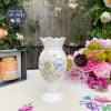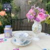 Mẫu gốm trắng với hoạ tiết hoa in chuyển tiết của những bông hoa đồng nội thời Tudor dịu dàng trước mắt. Hoa cẩm chướng, thanh cúc, hồng , hoa kim cương, hoa păng xê, hoa lavender hiện đẹp xinh trên thân lọ. Miệng lọ được xếp nhăn gốm mềm mại và nhọn như vương miện tạo thêm sự chi tiết kĩ càng của design.