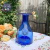 Trên bầu lọ bông hoa thuỷ tinh nổi hoa anh thảo xuân được thổi khéo léo & màu xanh biển đậm vừa toả sáng góc nhà.