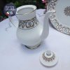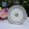 Nền sứ xương trắng với những dải vẽ cuộn tròn và hình cây đàn Lia phủ men xanh ngọc bích – hồng – nâu vàng và đan xem mạ vàng.