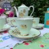 Set trà được trang trí bởi những bông hồng mạ vàng trên nền xanh bạc hà mát nhẹ.