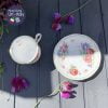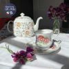 Những bông hoa đậu ngọt đỏ trầm & tím xanh xinh xắn trên tách & lót tách với viền xanh của màu lá vẽ trong lòng miệng tách & đĩa. Trong lòng tách có chữ Tháng 4.