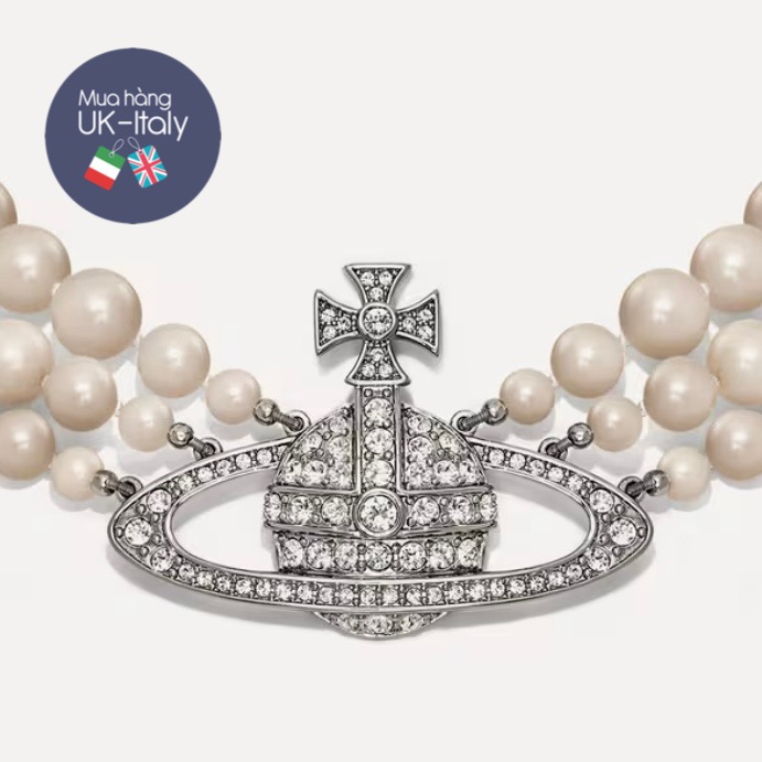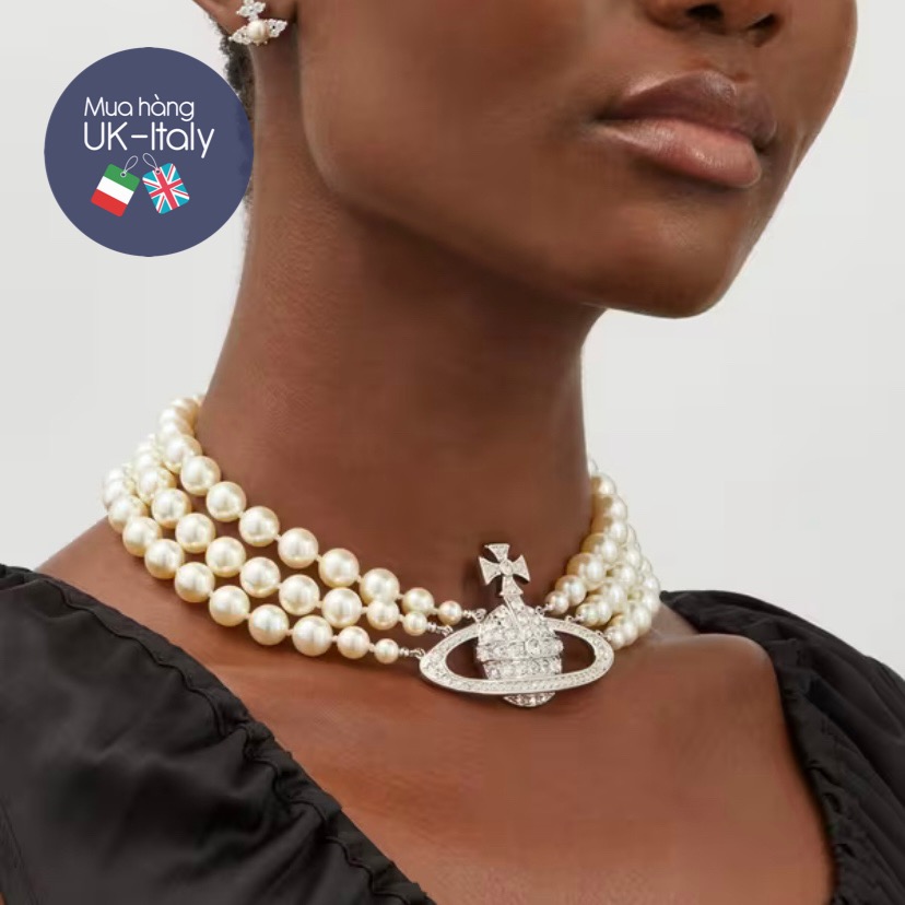 Vòng cổ ngọc trai 3 dây Vivienne Westwood cho bạn thích đeo sát cổ, đi kèm quả cầu gắn pha lê đeo với áo vest, áo hở cổ, áo có cổ ngắn đều auto xinh, sang phong cách Anh.